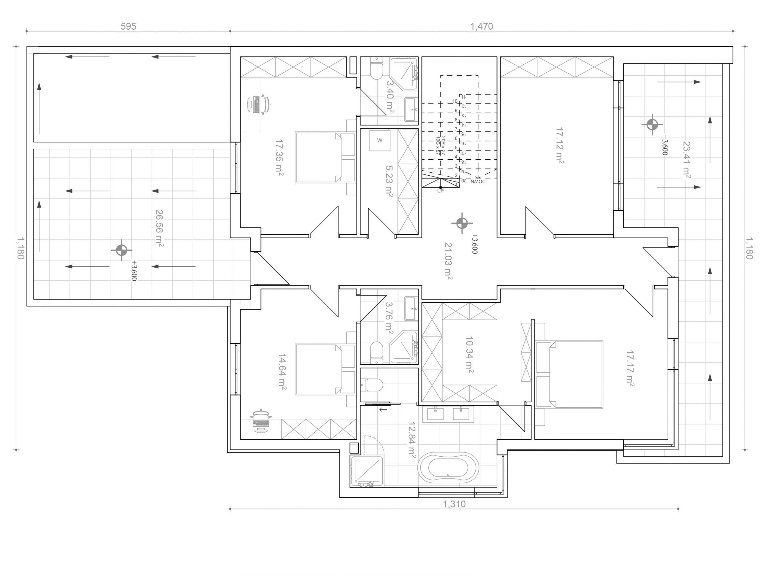 3 საძინებელი, 2 სვ. წერტილი, სამრეცხაო, ვერანდები.